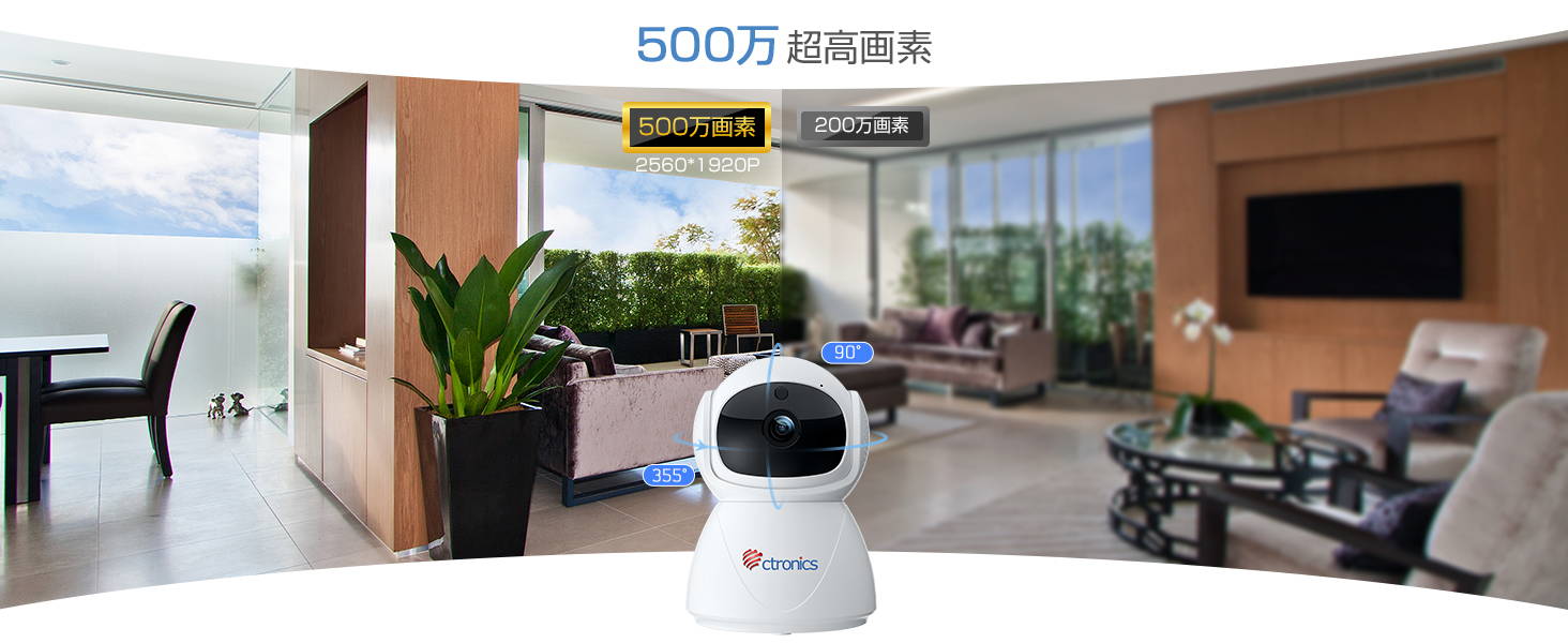 首振り機能を搭載し、上下90°左右355°で回転できて見たい角度をスマホで簡単に操作できます。
