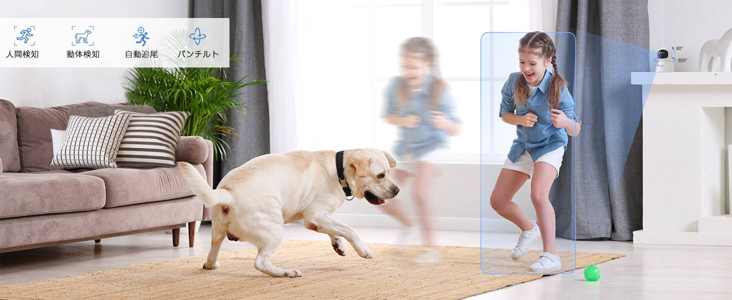 ・90°広角レンズを搭載するだけでなく、パンチルト機能で左右355°上下90°見渡せます。首振り速度が素早く子供やペットを確認したい場合は、部屋全体を写せて片隅に隠しても探せます。