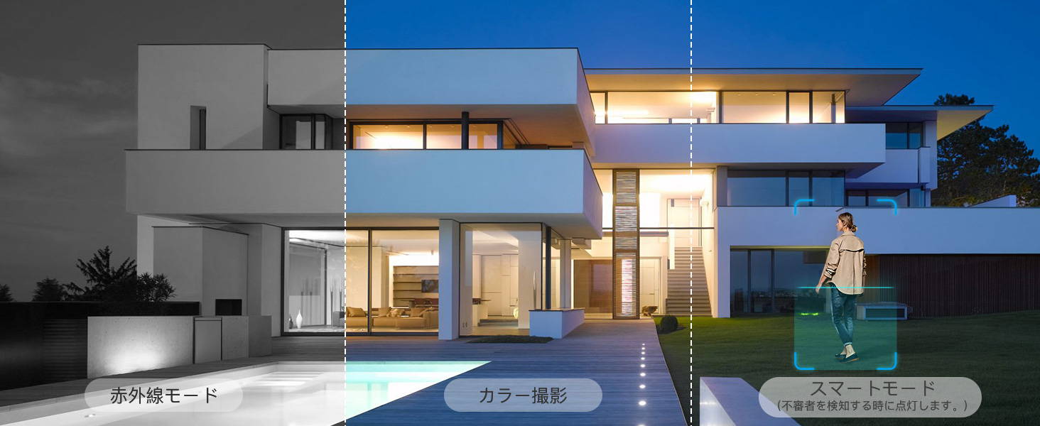 普通の防犯カメラは光線不足の夜間には監視画面はぼやけています。こちらの屋外ネットワークカメラは赤外線LEDライトが搭載されており、暗い場所でも明るい映像を提供できます。暗視モード、カラー撮影とスマートモードを自由に選択できます。スマート暗視モードには不審者を検知する時に点灯します。