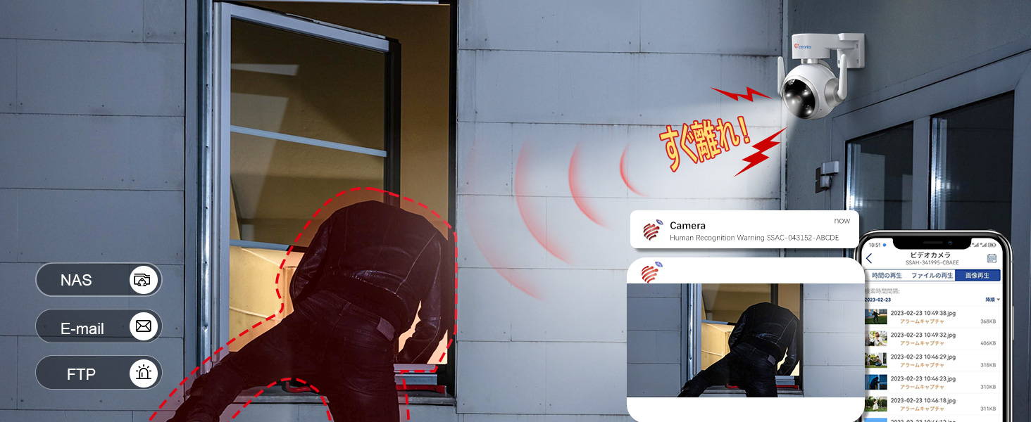 AI人体検知機能があり、人のみを検知し、雨、木の葉、動物、昆虫などによる誤警報を95%削減します。さらに、ネットワークカメラは人の動きを自動的に追跡できます。ターゲットが捕捉されると、防犯カメラがパン/チルトの動きを自動的に調整し、アプリでスマートフォンにアラーム通知を送信します。